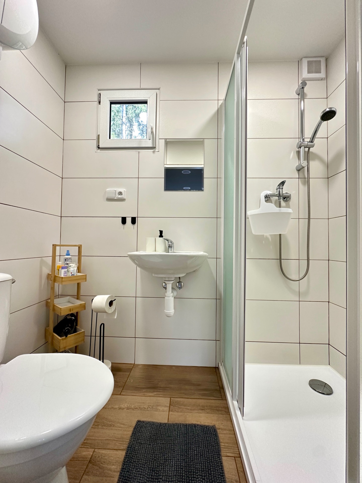 Najdete zde prostorný sprchový kout, umyvadlo i toaletu – vše pro vaše pohodlí během celého pobytu. Samozřejmostí je teplá voda a praktické vybavení pro každodenní hygienu.