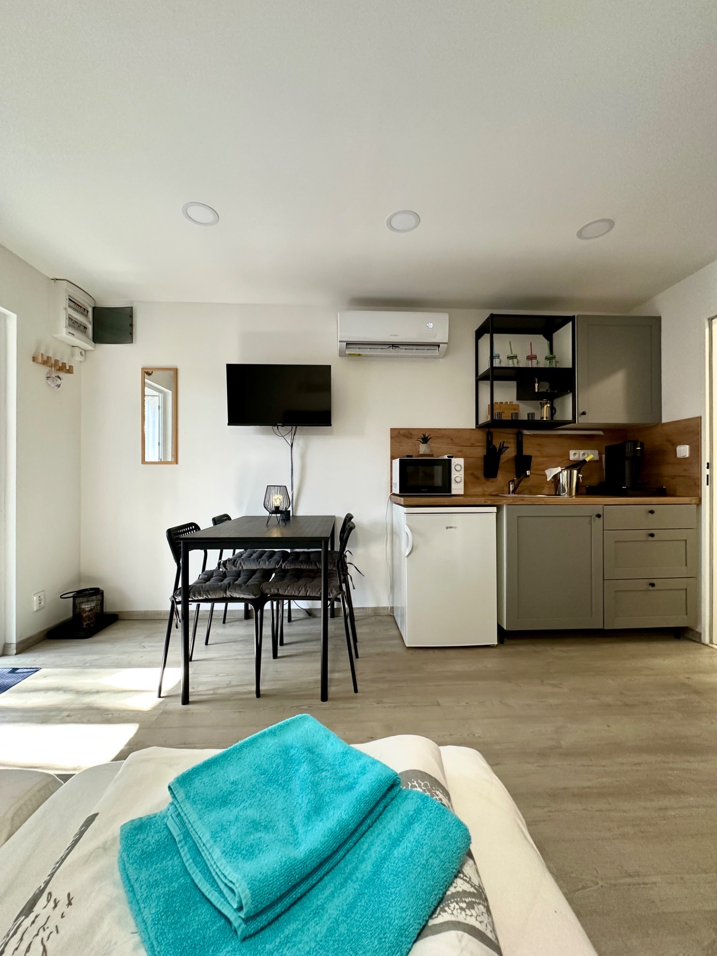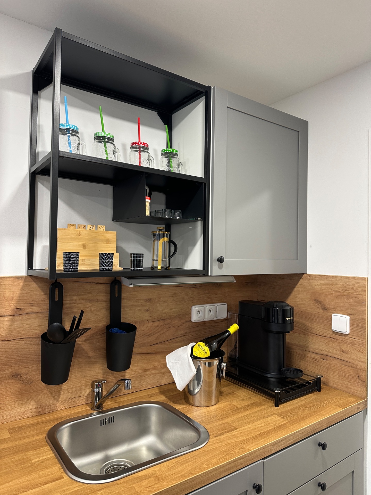 Pro zachování komfortu a bezpečnosti není kuchyň vybavena klasickým vařičem, což zároveň podporuje jednoduchý a bezstarostný styl pobytu.